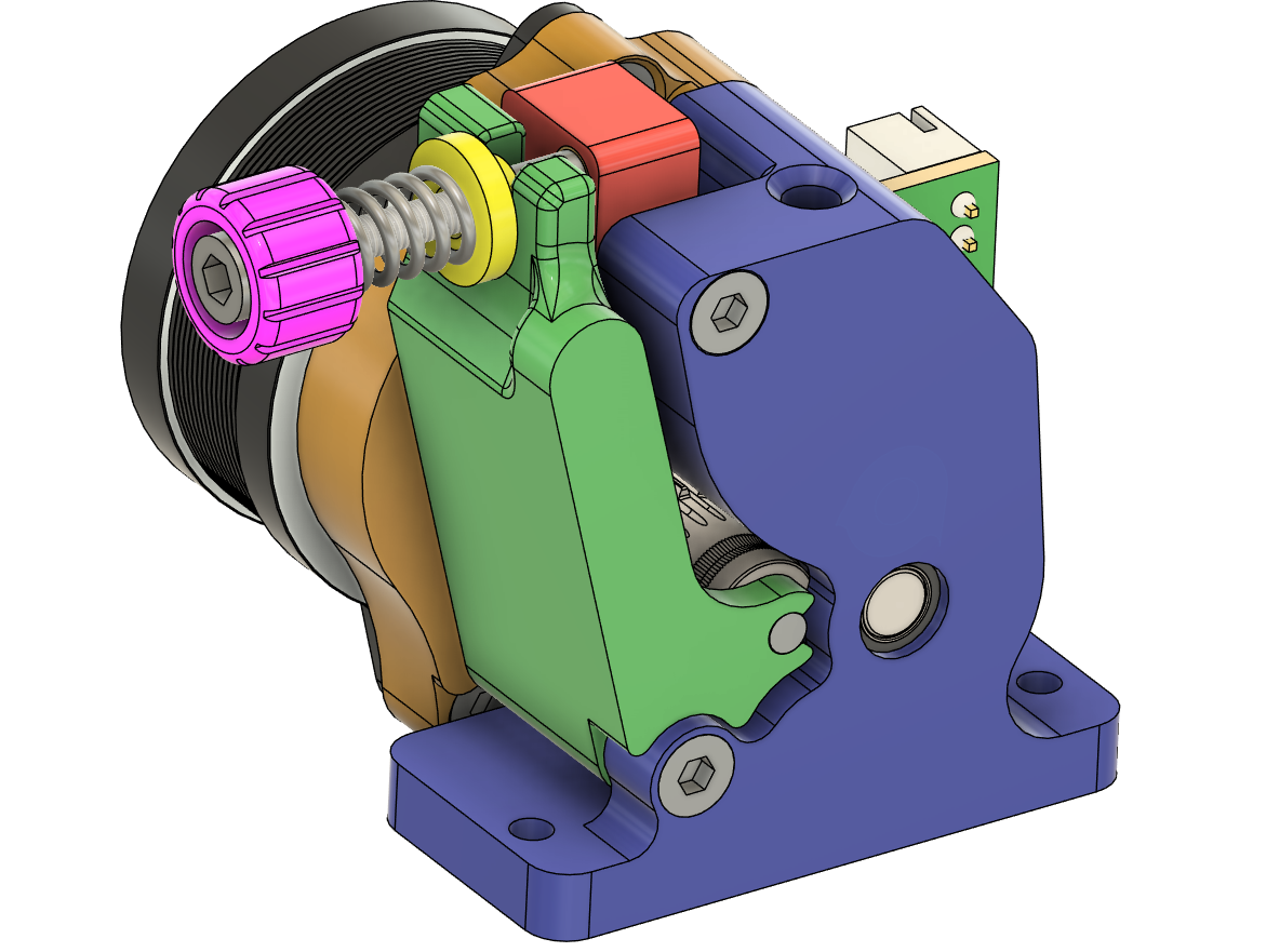 Thumper is a low cost and easy to manufacture direct drive filament extruder. This extruder is based around a 50:10t gear reduction and BMG gear set, just like Sherpa and a few other popular extruders. Thumper is designed with a few additional features in mind, specifically an integrated IR beam break acting as a runout sensor and a quick release latch to open and fix/clean your extruder more quickly and without losing your tension.