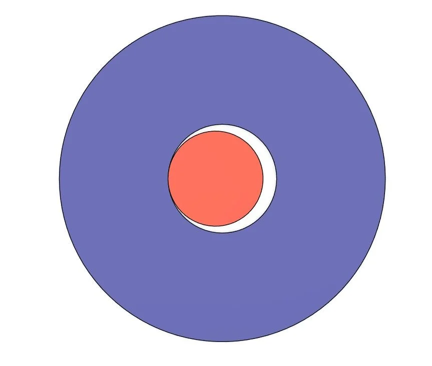 A visual representation of the issue with an oversized melt zone bore. Blue is hotend, red is filament.